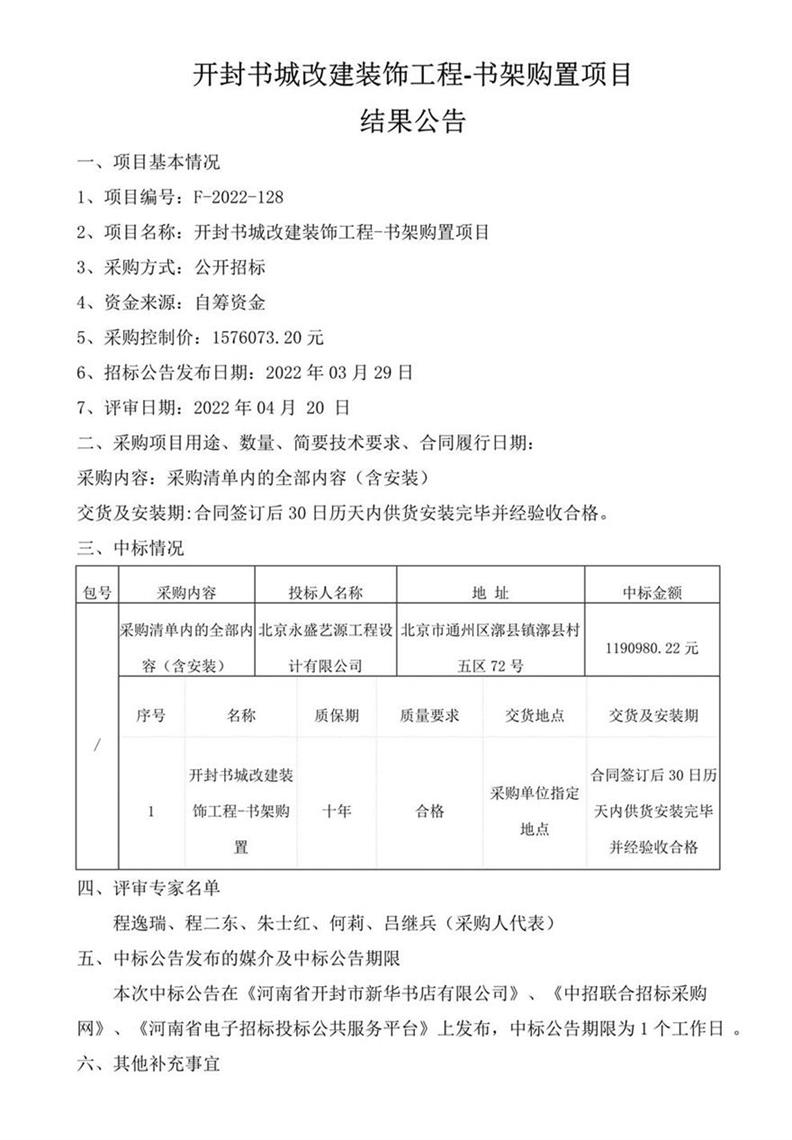 開(kāi)封書(shū)城改建裝飾工程-書(shū)架購(gòu)置項(xiàng)目結(jié)果公告