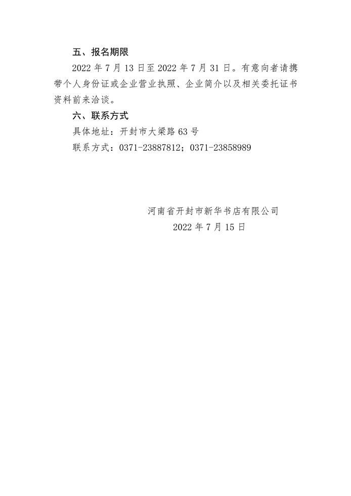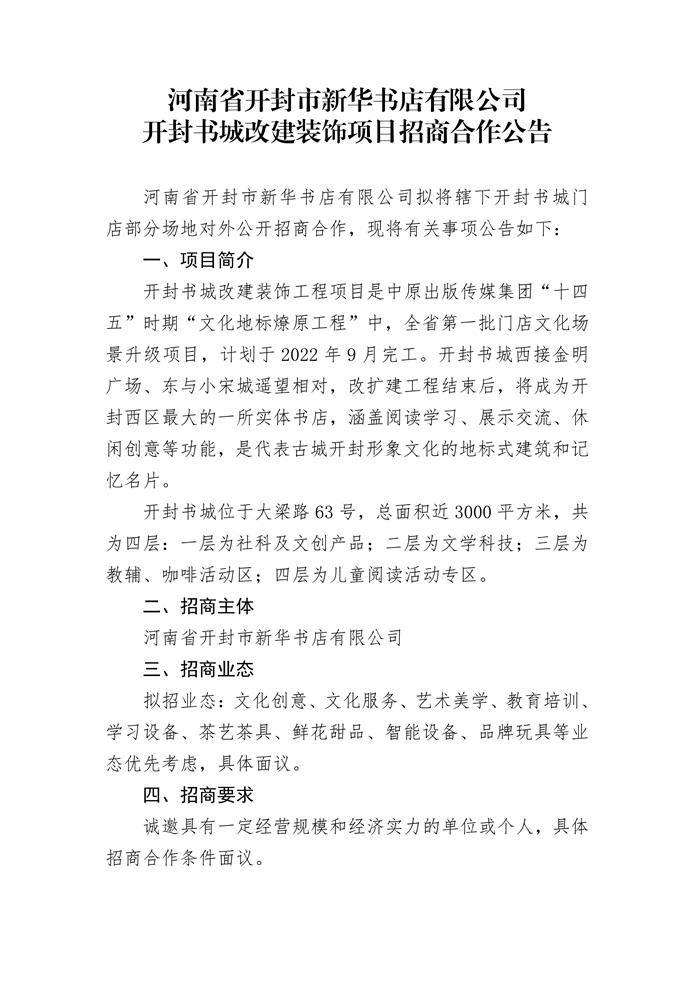河南省開封市新華書店有限公司開封書城改建裝飾項(xiàng)目招商合作公告